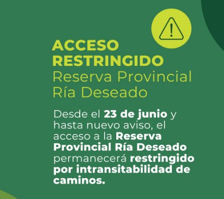Debido al mal estado de los caminos por las condiciones climáticas de los últimos días, queda restringido el ingreso a la reserva desde el 23 de junio y hasta nuevo aviso.