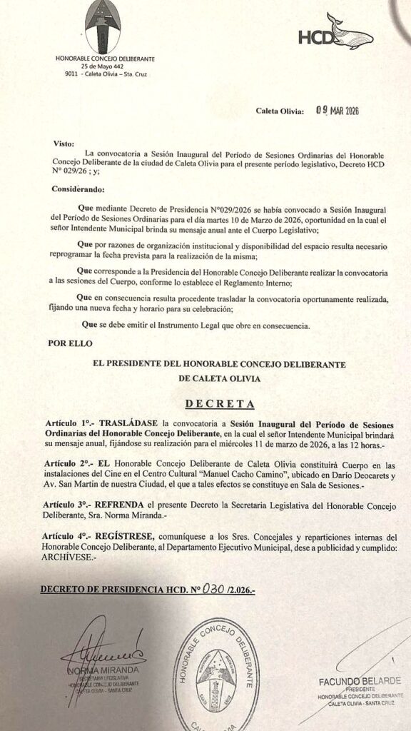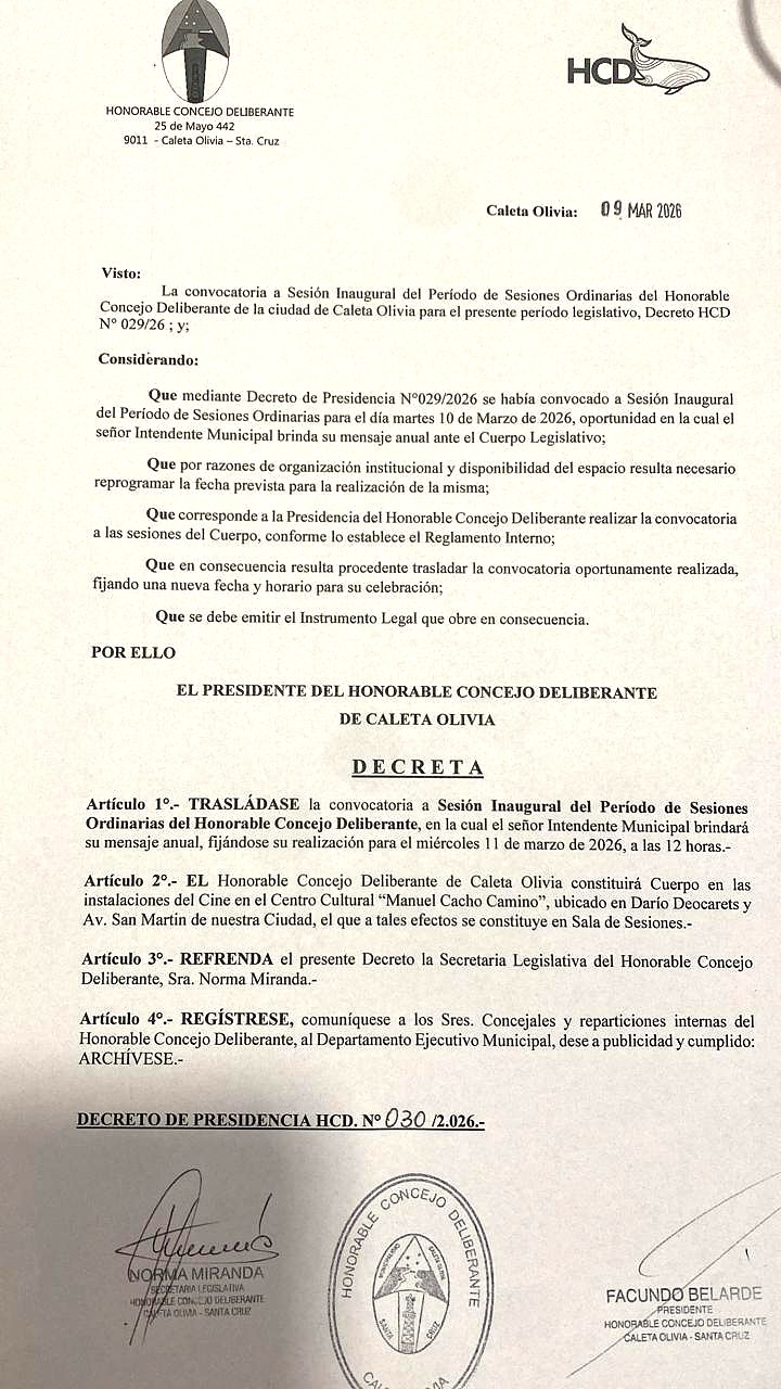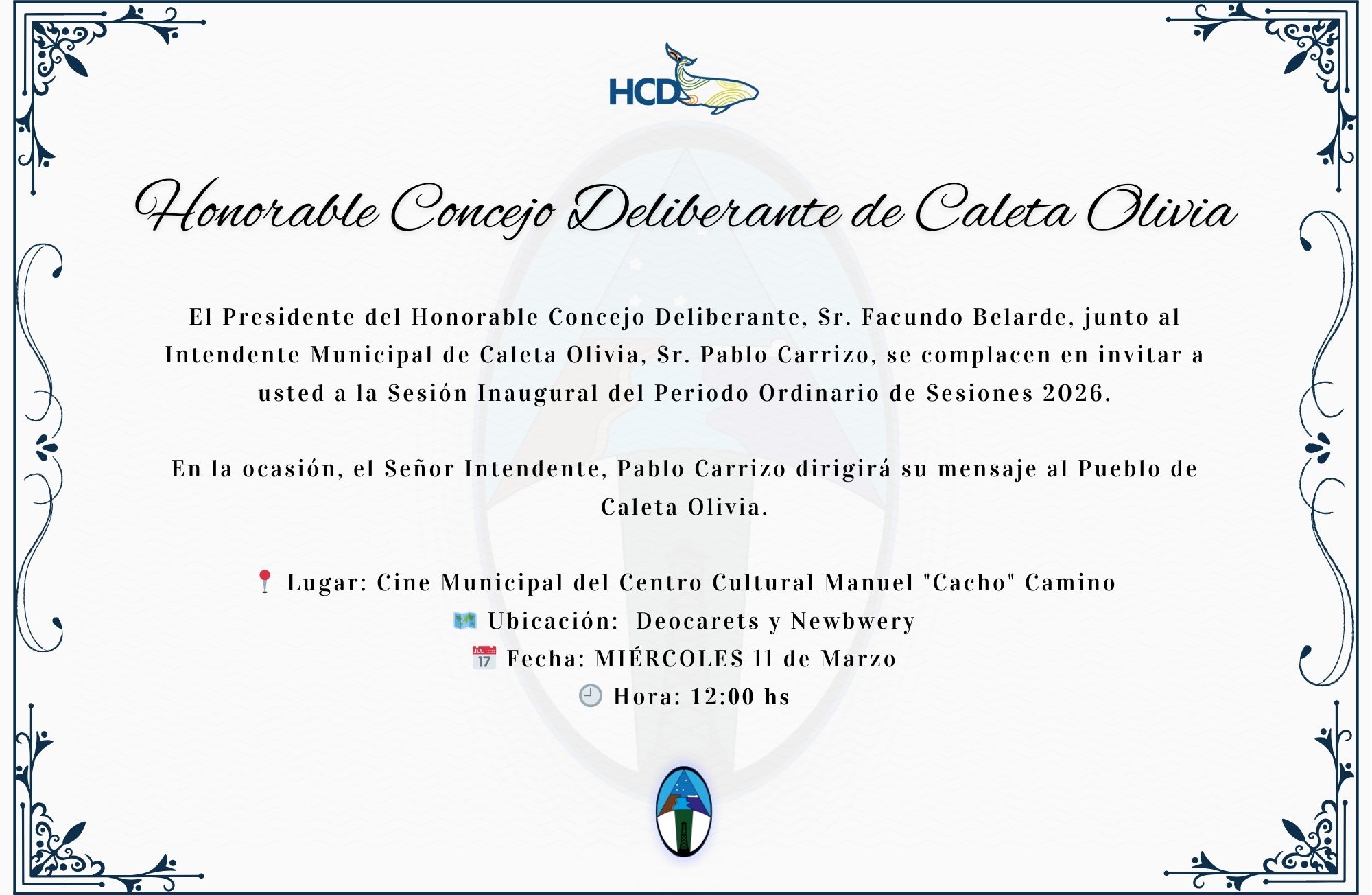 Es por ello que, el Presidente del Honorable Concejo Deliberante, Sr. Facundo Belarde, junto al Intendente Municipal de Caleta Olivia, Sr. Pablo Carrizo, se complacen en invitar a usted a la Sesión Inaugural del Periodo Ordinario de Sesiones 2026.