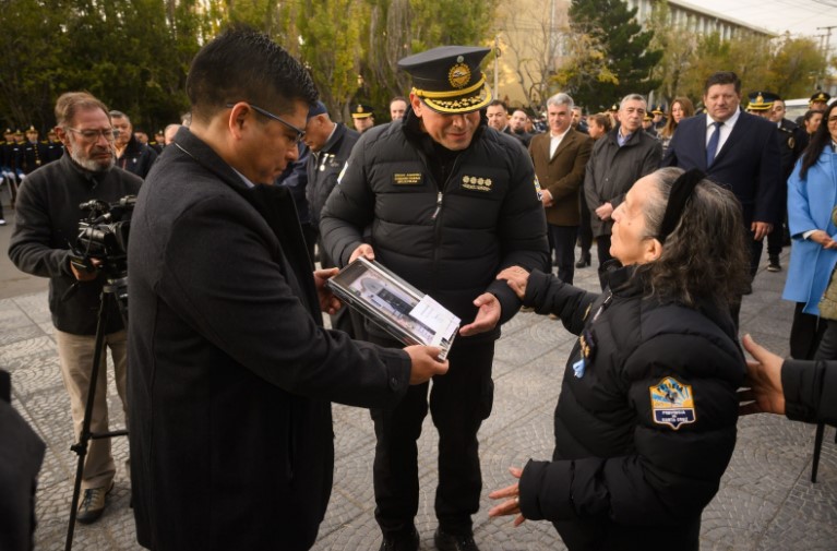 Otro momento significativo tuvo lugar cuando el titular del Ejecutivo Provincial, le entregó un presente especial a la vecina Lioba Bustamante. Desde hace más de 40 años, la vecina acompaña los actos que se hacen en Jefatura de Policía y cumple años, precisamente, el 2 de abril.