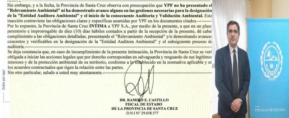 La intimación, firmada por el fiscal de Estado, Dr. Ramiro E. Castillo, otorga a YPF un plazo perentorio e improrrogable de diez (10) días hábiles para presentar el relevamiento y acreditar avances concretos en el proceso de auditoría. En caso contrario, la Provincia de Santa Cruz iniciará las acciones legales correspondientes para hacer valer los derechos y resguardar los intereses ambientales y patrimoniales del territorio provincial.