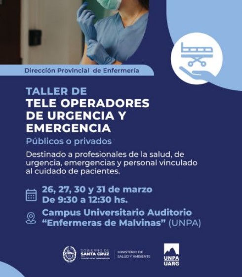 El Ministerio de Salud y Ambiente, a través de la Dirección Provincial de Enfermería, realizará el «Taller de Teleoperadores de Urgencia y Emergencia» en la UNPA-UARG. La actividad está destinada a profesionales de la salud, personal de urgencias y emergencias, y a todos aquellos que se desempeñan en contacto directo con pacientes, tanto en el ámbito público como privado.
