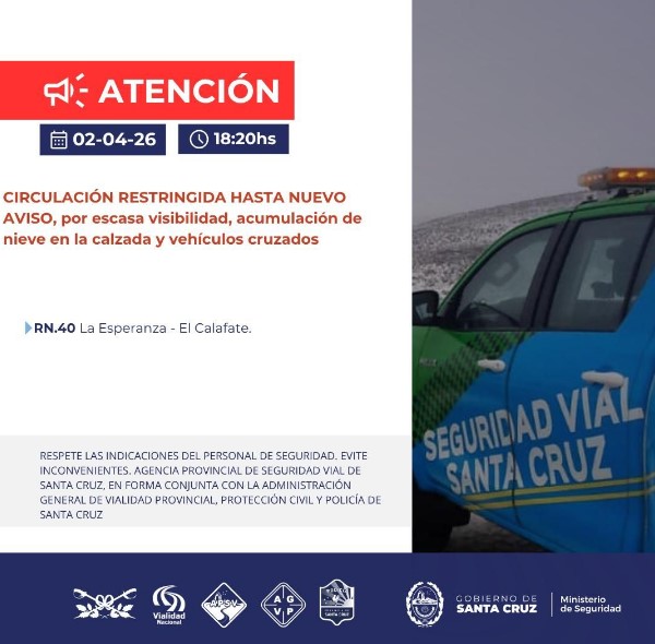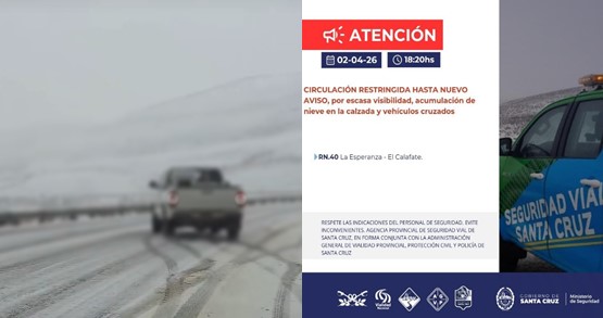Circulación restringida, hasta nuevo aviso, por escasa visibilidad, acumulación de nieve en la calzada y vehículos cruzados, sobre la Ruta Nacional N° 40 La Esperaza – El Calafate