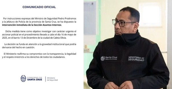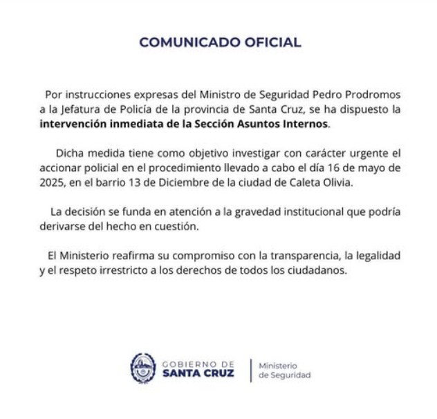 Por expresas instrucciones del ministro de Seguridad, Pedro Prodromos, dirigidas a la Jefatura de Policía de la provincia de Santa Cruz, se ha dispuesto la intervención inmediata de la Sección Asuntos Internos.