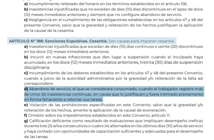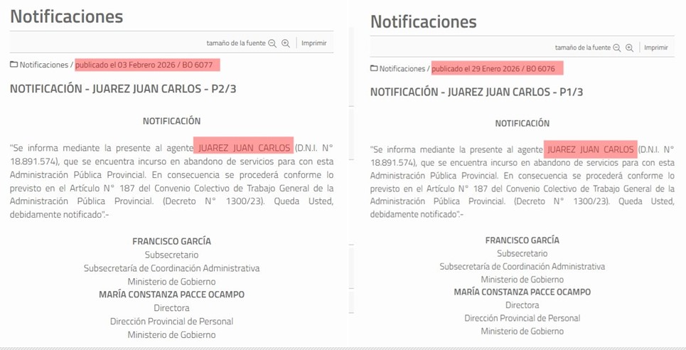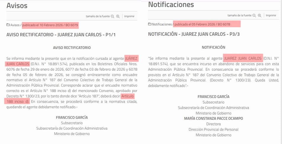 “Se informa mediante la presente al agente JUAREZ JUAN CARLOS (D.N.I. N° 18.891.574), que se encuentra incurso en abandono de servicios para con esta Administración Pública Provincial. En consecuencia se procederá conforme lo previsto en el Artículo N° 188 inciso d) del Convenio Colectivo de Trabajo General de la Administración Pública Provincial. (Decreto N° 1300/23). Queda Usted, debidamente notificado».-