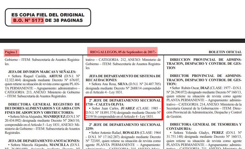 2º JEFE DE DEPARTAMENTO SECCIONAL 1710 – CALETA OLIVIA: • Señor Juan Carlos, JUAREZ (CLASE: 1985 – D.N.I. Nº 18.891.574) designado mediante Decreto Nº 2119/16 comprendido en el Artículo 4 – Ley 1831.-