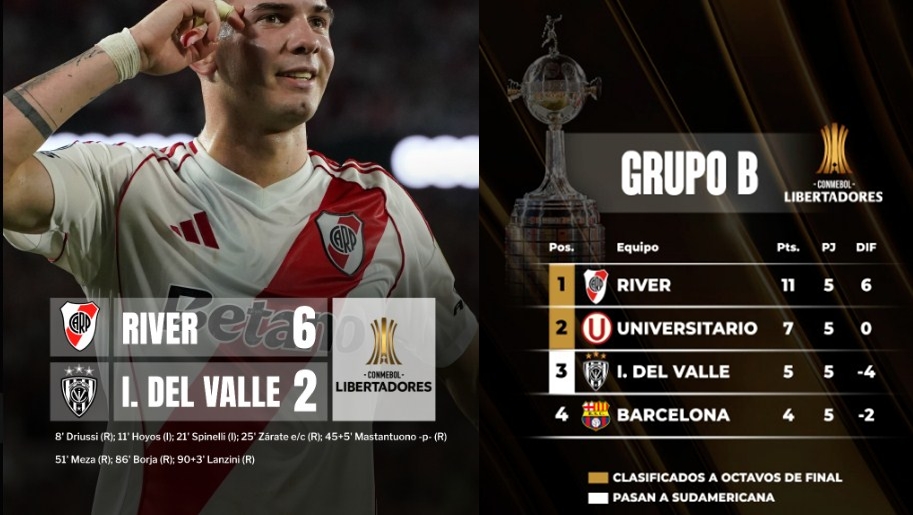 El Millonario le ganó a Independiente del Valle por 6-2, con goles de Driussi, Mastantuono, Maxi Meza, Borja y Lanzini. Uno de los goles fue en contra