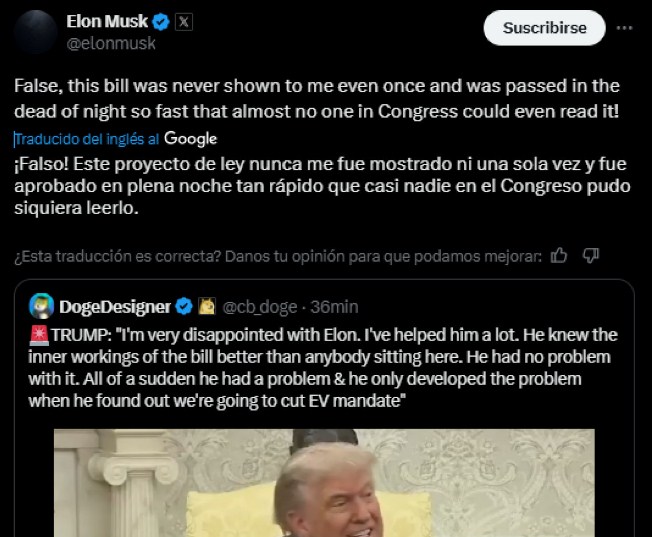 Musk había llamado esta semana «abominación repugnante» a dicho proyecto y había criticado a los republicanos que ya lo han votado, acusándoles de haber cometido un «error» al respaldar una iniciativa que incrementará la deuda pública.