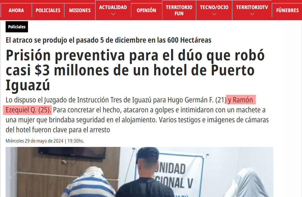 29 MAYO DE 2024.- Prisión preventiva para Ramón Ezequiel Quipildor por el robo de casi 3 millones a un hotel en Puerto Iguazú. Así lo dispuso el Juzgado de Instrucción Tres de Iguazú para Ramón Ezequiel Quipildor (25) y Hugo Germán F. (21). Para concretar el hecho, atacaron a golpes e intimidaron con un machete a una mujer que brindaba seguridad en el alojamiento. Varios testigos e imágenes de cámaras del hotel fueron clave para el arresto.-