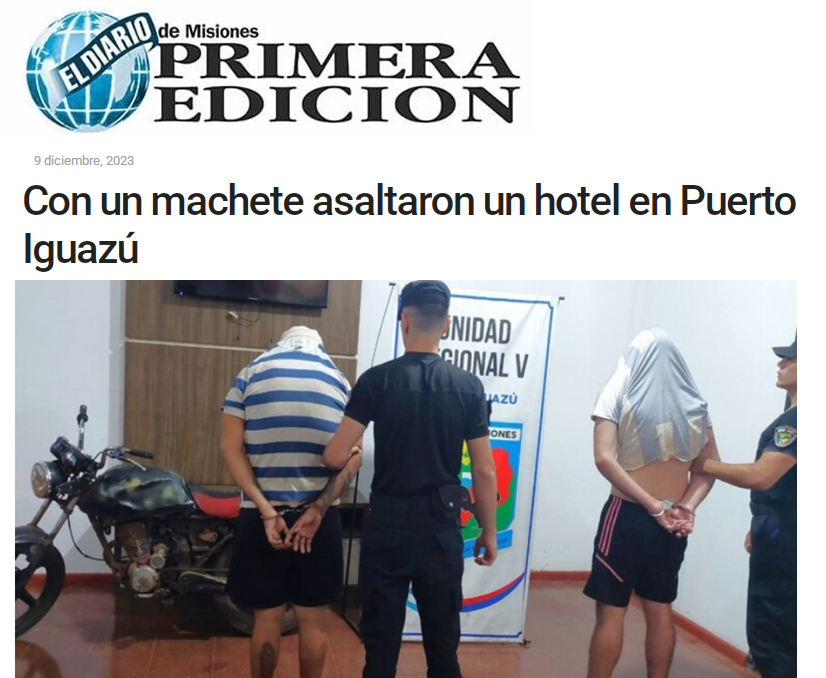 9 DICIEMBRE DE 2023.- Dos delincuentes asaltaron el hotel Yvy en Puerto Iguazú, redujeron a la guardia (mujer) con machete, la golpearon con trompadas y patadas en el piso y se llevaron alrededor de tres millones de pesos.-