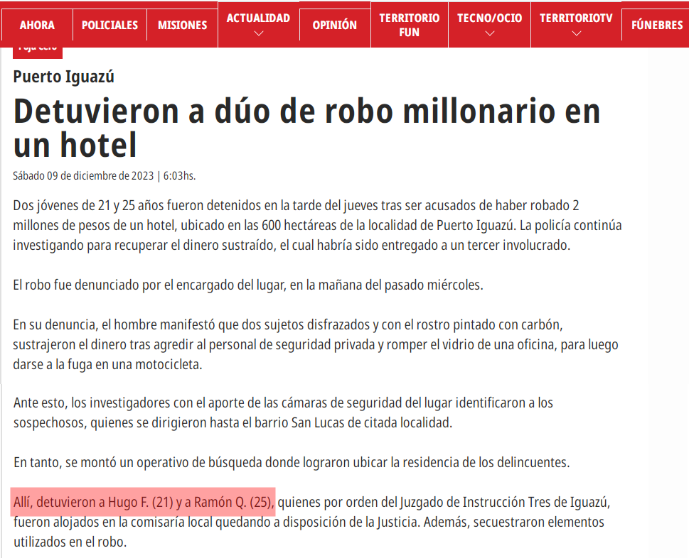 DICIEMBRE 2023: RAMÓN EZEQUIEL QUIPILDOR, EL HIJO PRESO EN MISIONES POR ROBO AGRAVADO. MACHETE EN MANO, DÁNDOLE PATADAS A UNA MUJER EN EL PISO QUE TRABAJABA DE SEGURIDAD, ROBABA 3 MILLONES DE PESOS DE UN HOTEL