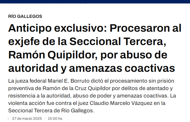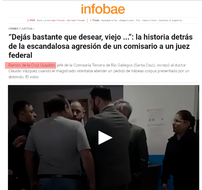 DICIEMBRE 2023,Comisaría 3ra de Río Gallegos: Ramón Quipildor, jefe de la Comisaría Tercera de Río Gallegos, increpó e insultó al Juez Claudio Vázquez cuando el magistrado intentaba atender un pedido de hábeas corpus presentado por un detenido.-