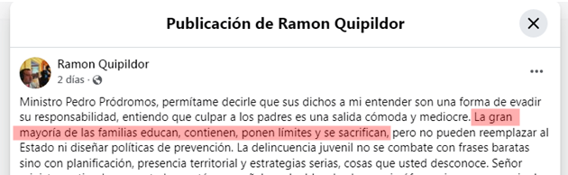 FEBRERO 2026: Hace un par de días atrás, el procesado Ramón de la Cruz Quipildor publicó en su red social de facebook una catarata de incongruencias con narrativa ficticia, entre ellas, criticaba sin sentido al Ministro de Seguridad de la Provincia, y para rematar agregó «La gran mayoría de las familias educan, contienen, ponen límites y se sacrifican».-