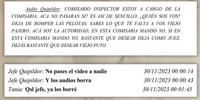 Descolocado, Quipildor despotricó a los gritos contra el magistrado: “Estoy a cargo de la comisaria. Es así de sencillo, ¿Quién sos vos? deja de romper las pelotas; sabes lo que te falta a vos viejo pajero!, acá soy la autoridad. En esta comisaria mando yo. Bastante que desear dejas como juez, viejo puto!”