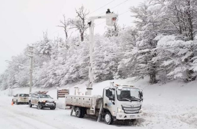 Las cuadrillas de Servicios Públicos (SPSE) intervinieron de manera inmediata ante contingencias causadas por la acumulación de nieve sobre el tendido eléctrico. Los distritos de 28 de Noviembre, Río Turbio y la localidad cordillerana ya cuentan con el servicio normalizado.